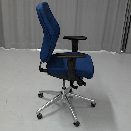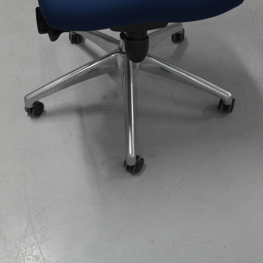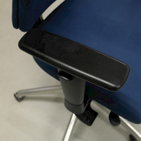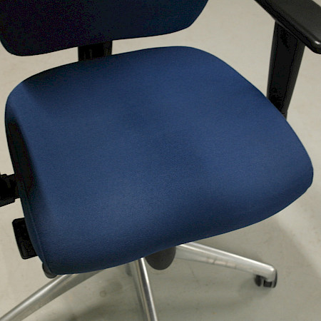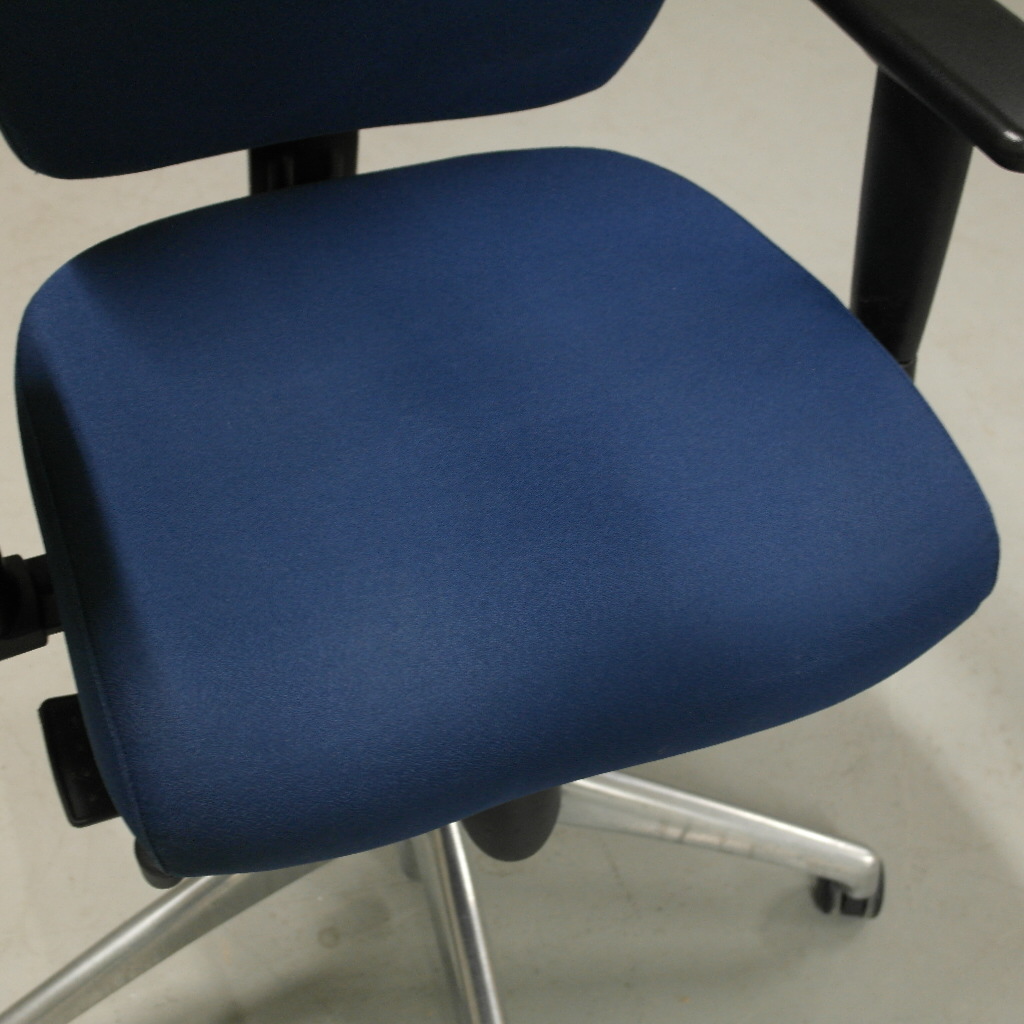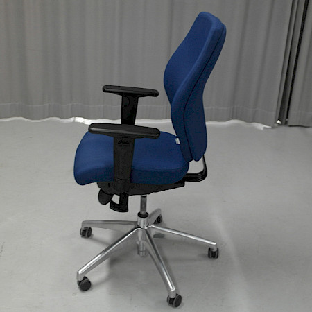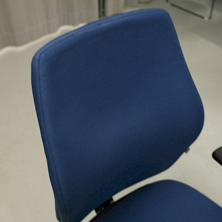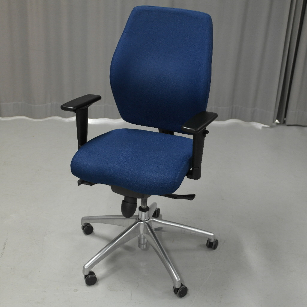 Siistikuntoisia Alice Lux työtuoleja, väri sininen , jalkaristikko kromattu metalli, säädettävä istuinsyvyys, istujan painon mukaan säädettävä keinumekanismi, selkänojan ja istuimen korkeuden säätö, käsinojien korkeuden säätö.