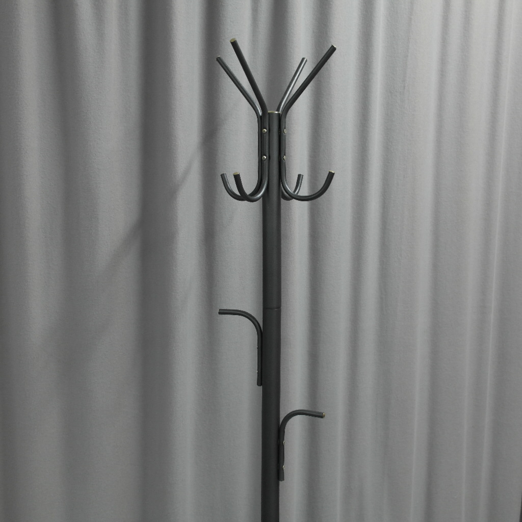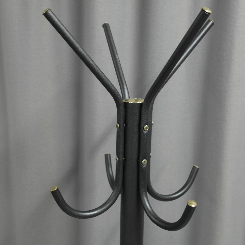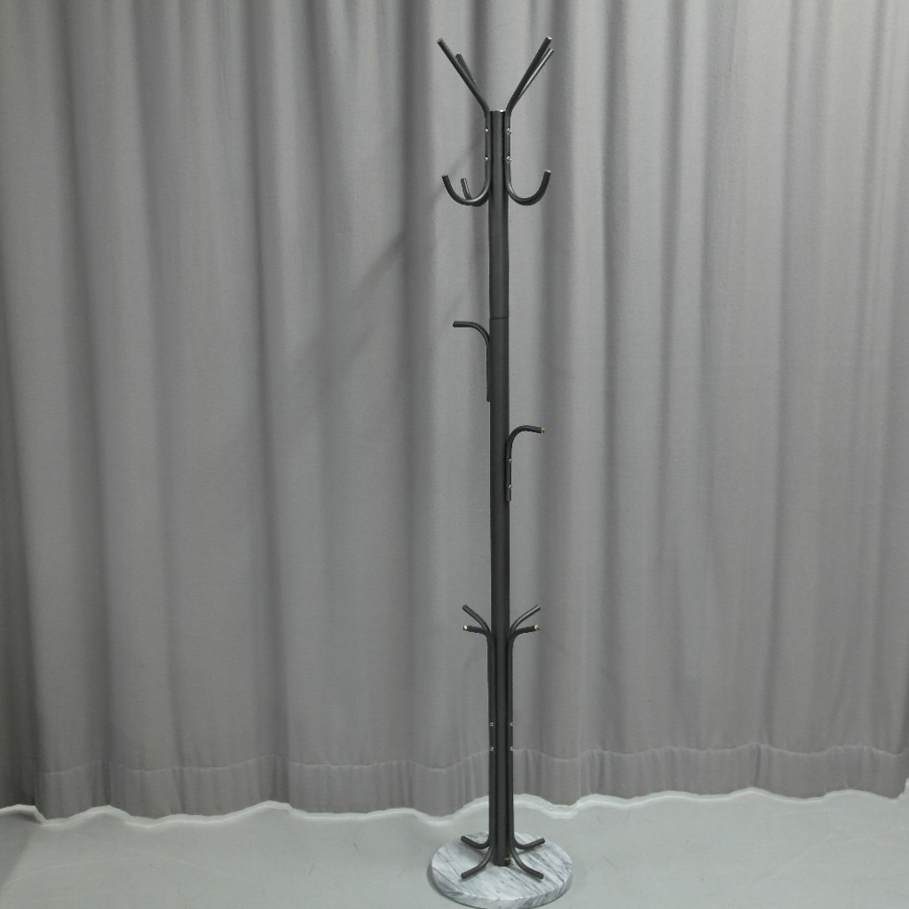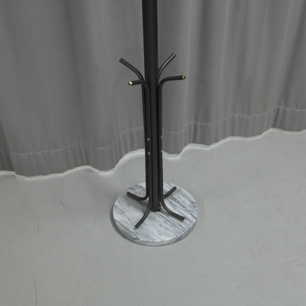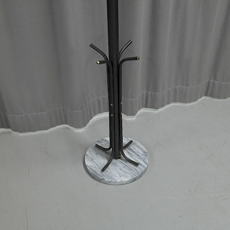 Siistikuntoinen lattianaulakko marmorijalustalla, 4-ripustuspaikkaa takeille/ hatuile, 4-paikkaa kasseille, väri tummanharmaa, jalusta vaaleanharmaa.