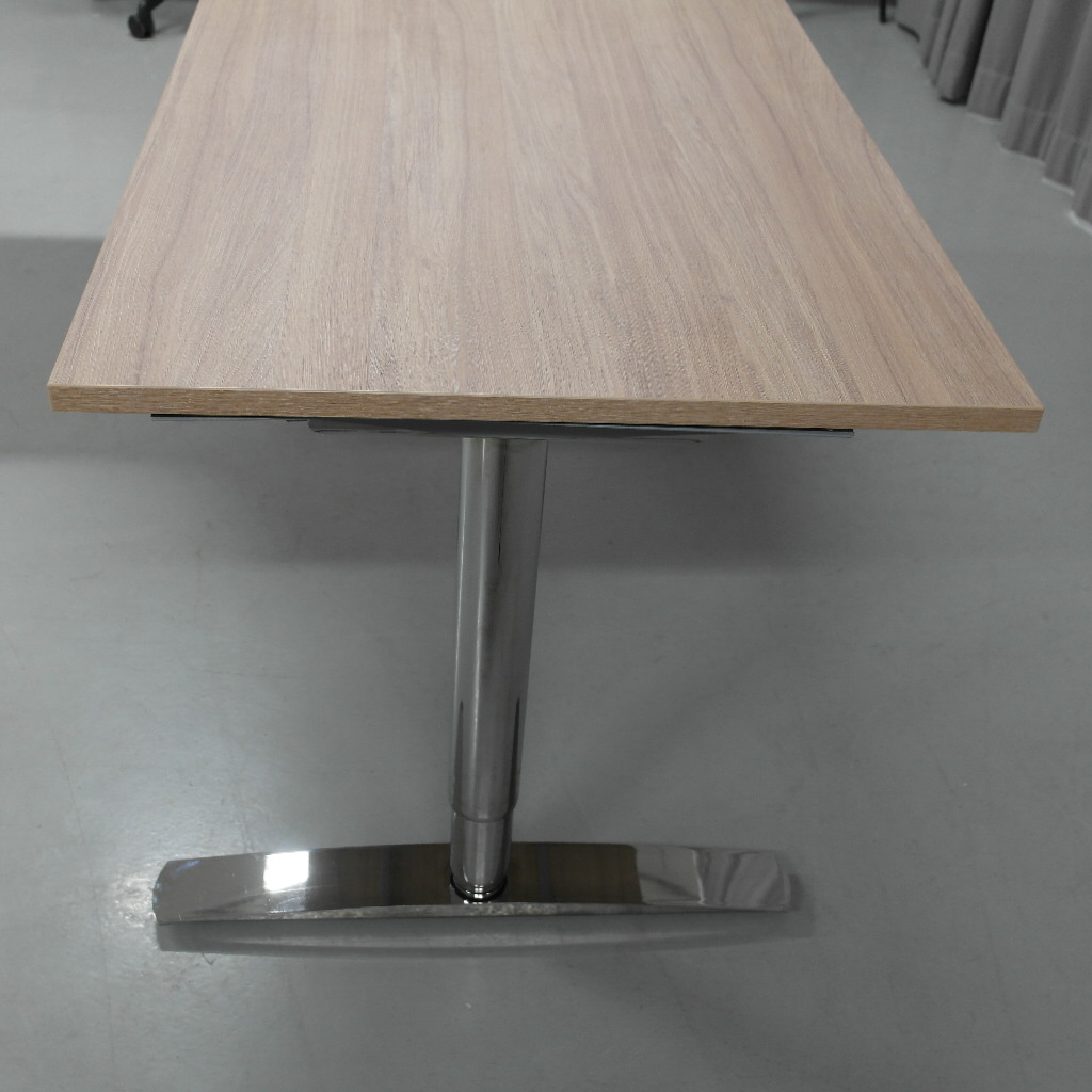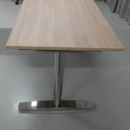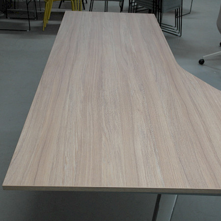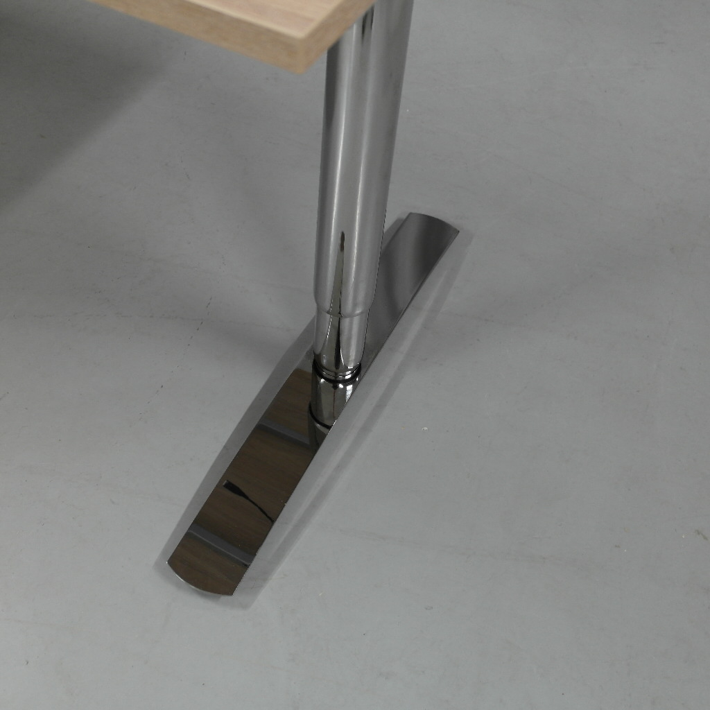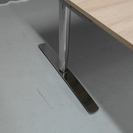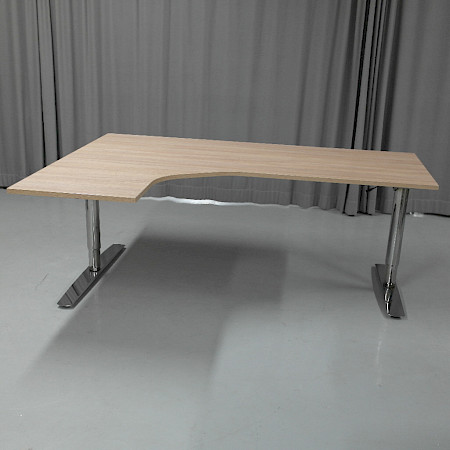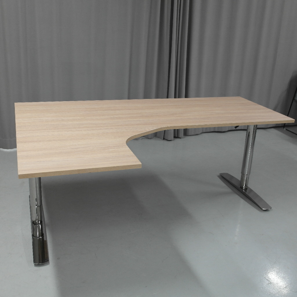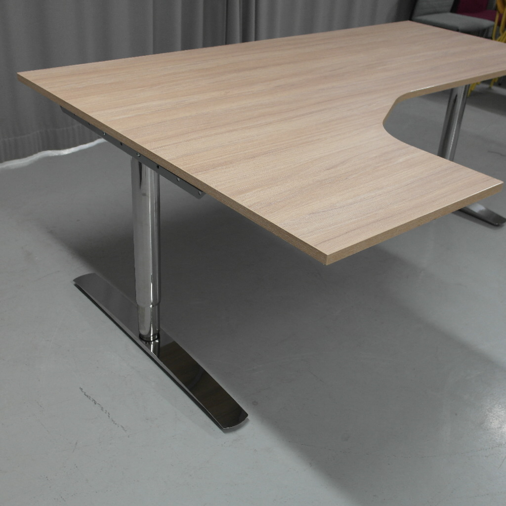 Hienokuntoinen vasenkätinen kulmasähköpöytä, kansi tammi ( kannen väri on aavistuksen tummempi kuin kuvissa) , runko kromattu teräs.