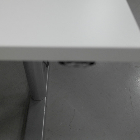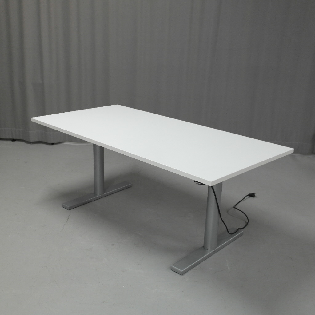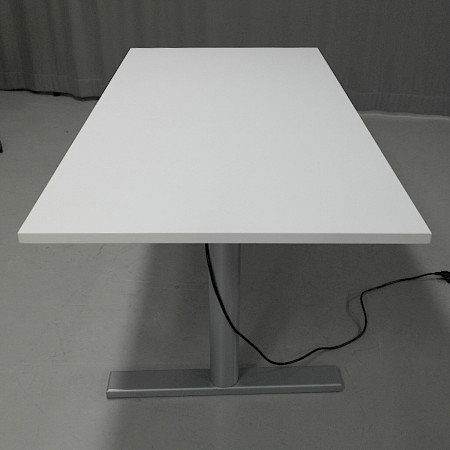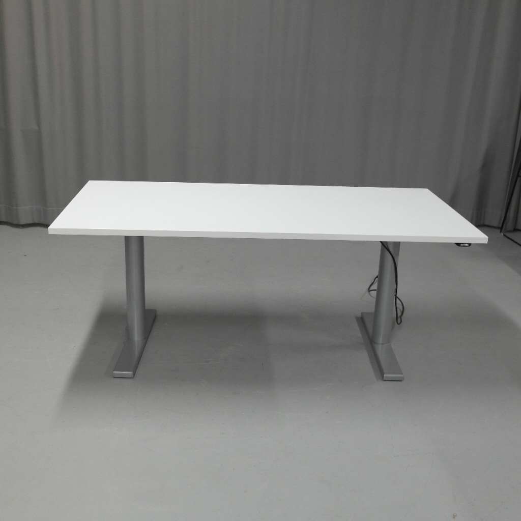 Linak-sähköpöytä valkoisella 160*80cm melamiinikannella, runko/ jalat vaaleanharmaa. Pöydän korkeuden säätöalue 64-129cm.