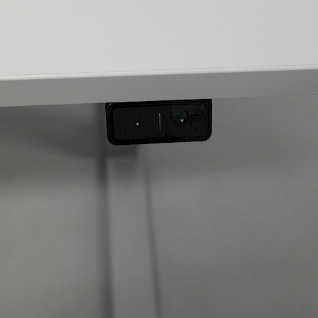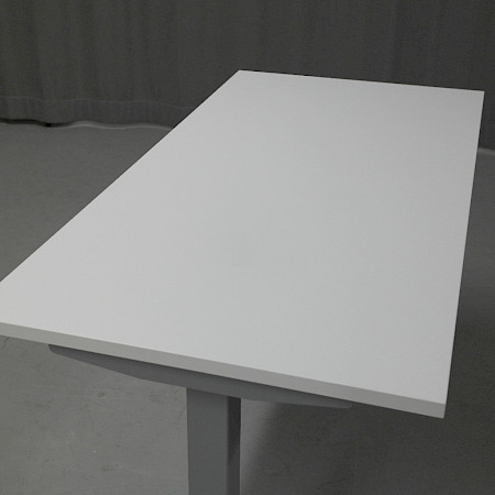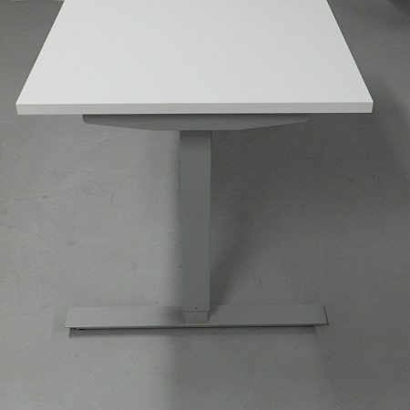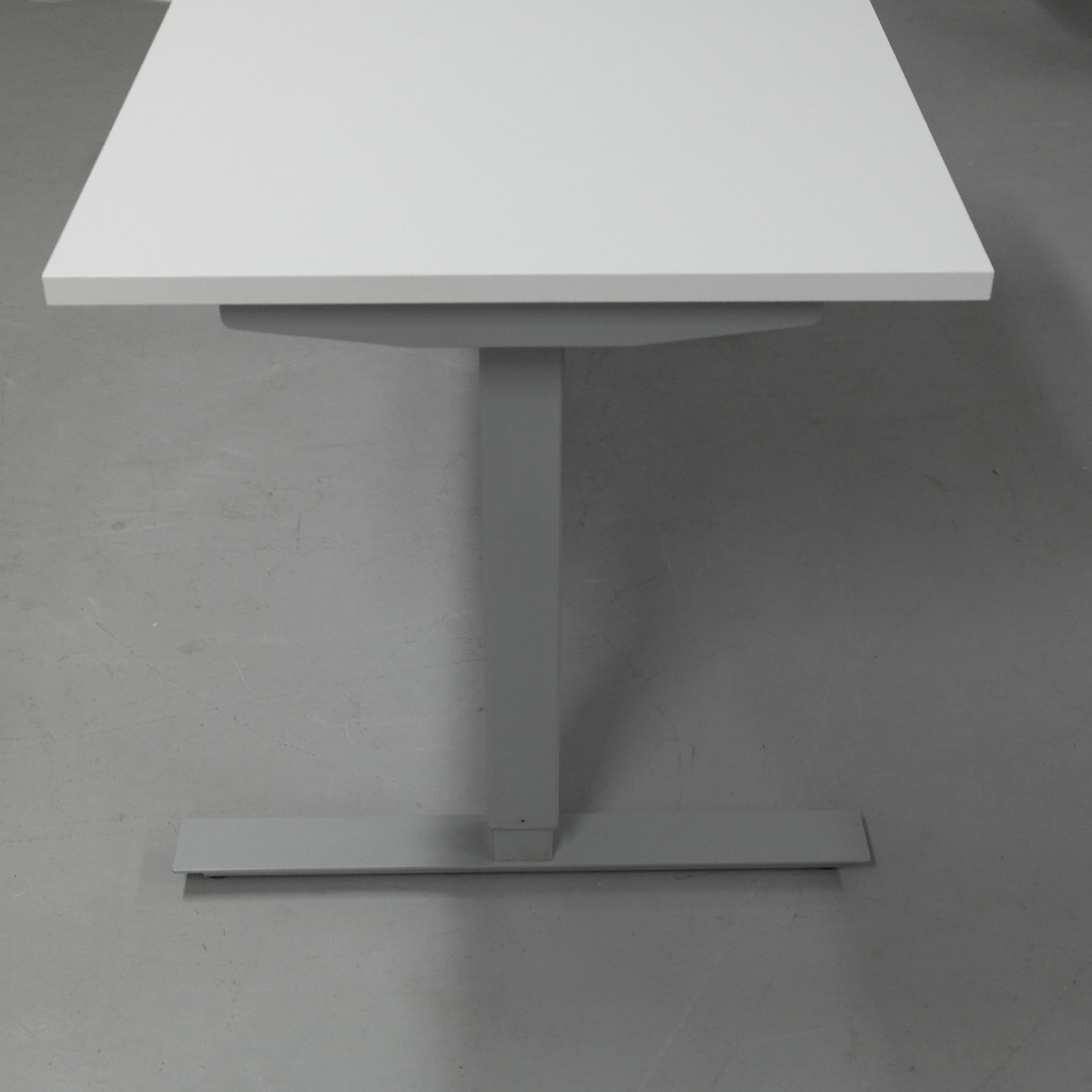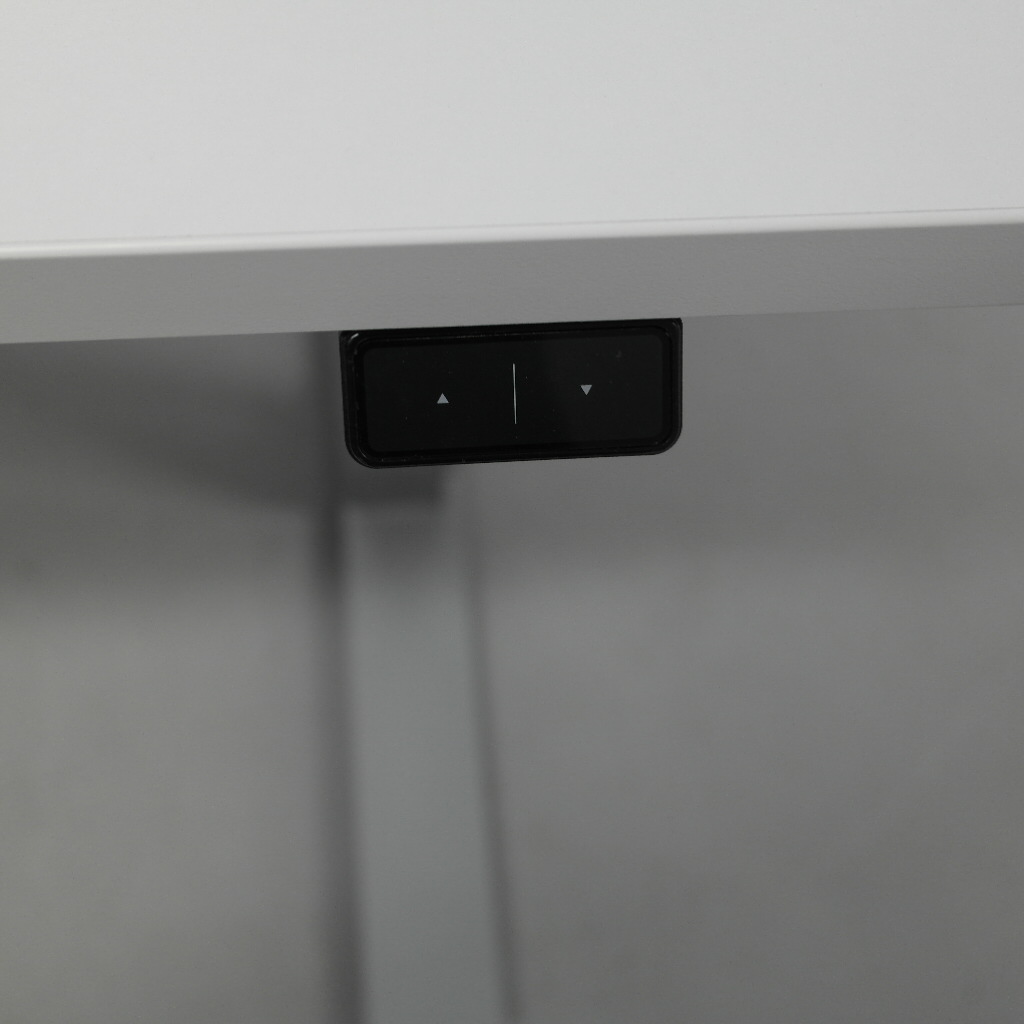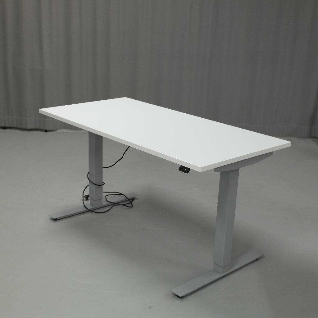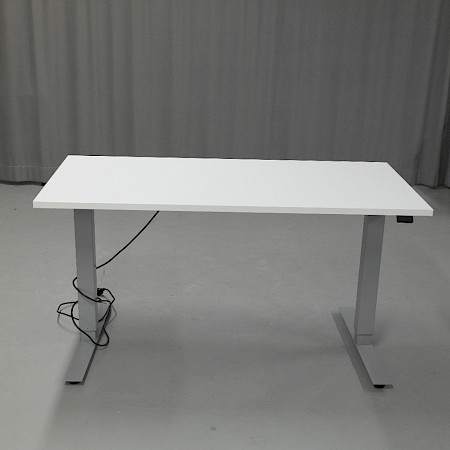 Hienokuntoinen sähköpöytä uudella 140*70cm melamiinikannella, runko/jalkaosa vaaleanharmaa, korkeuden säätöalue: 68-118cm.