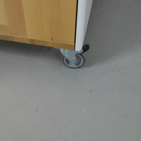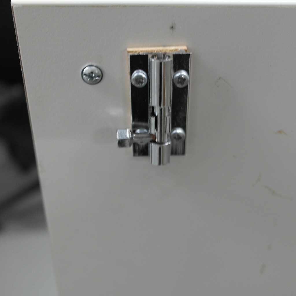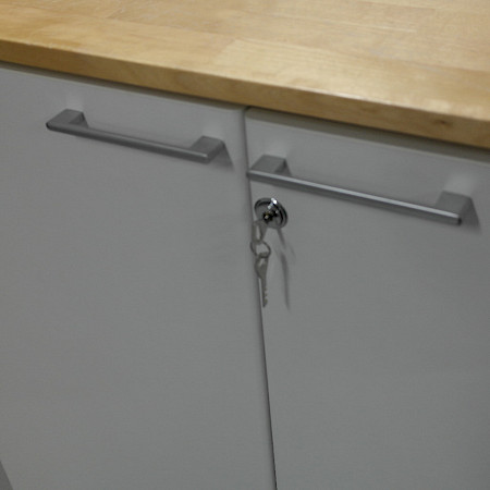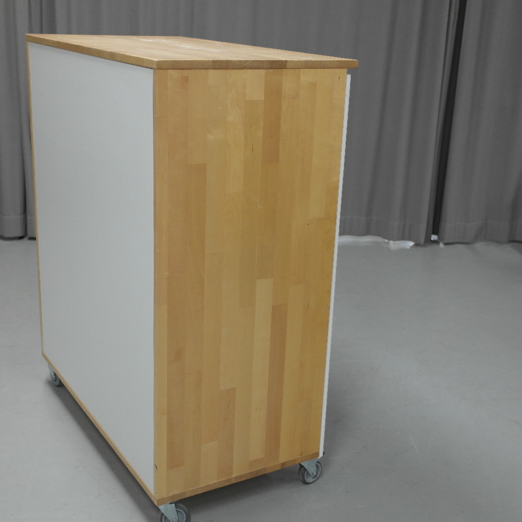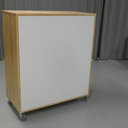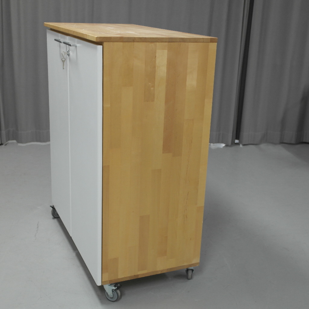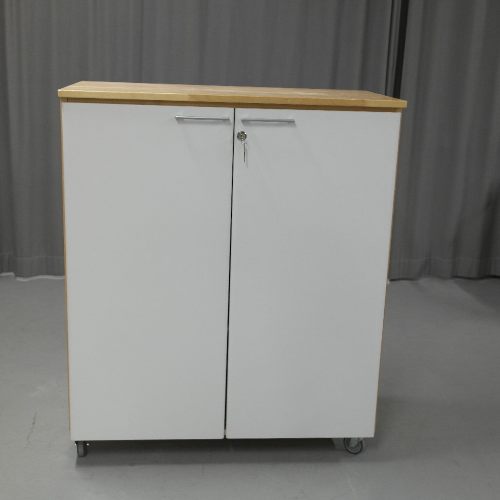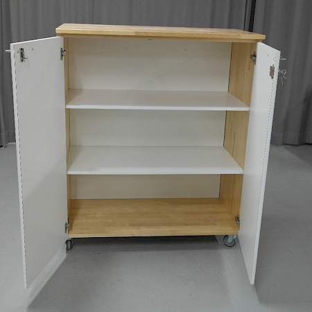 Jämäkkä lukittava ovikaappi pyörillä. ovet sekä tausta valkoinen ,runko koivu, vetimet kiilotettu teräs, pyörät joita etumaiset lukittavat. 3-hyllyväliä joita voi tarpeen mukaan muuttaa.