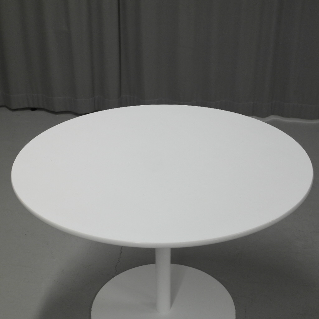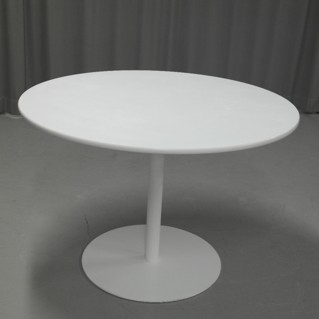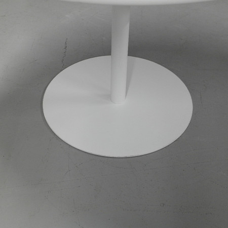 Siistikuntoinen ja tukeva pyöreäpöytä, kansi valkoinen 105cm, korkeus 72cm, jalkaosa valkoinen, laipan halkaisija 60cm.