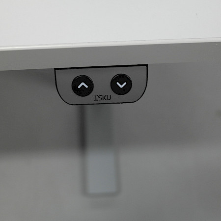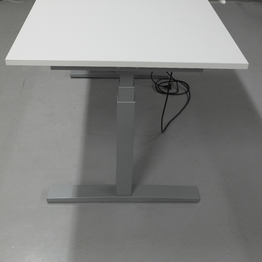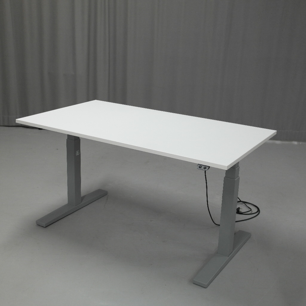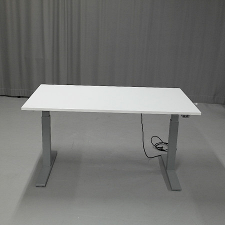 Siistikuntoinen sähköpöytä 140*80cm valkoisella melamiinikannella, runko/jalat vaaleanharmaat, pöydän korkeuden säätöalue: 62-127cm.